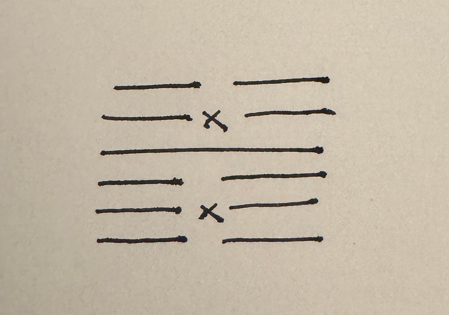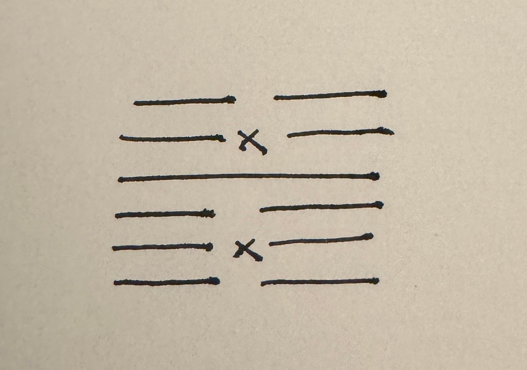 I throw six times. Pause after each throw to draw the lines from the bottom up, creating an ancient Chinese hexagram of divination.