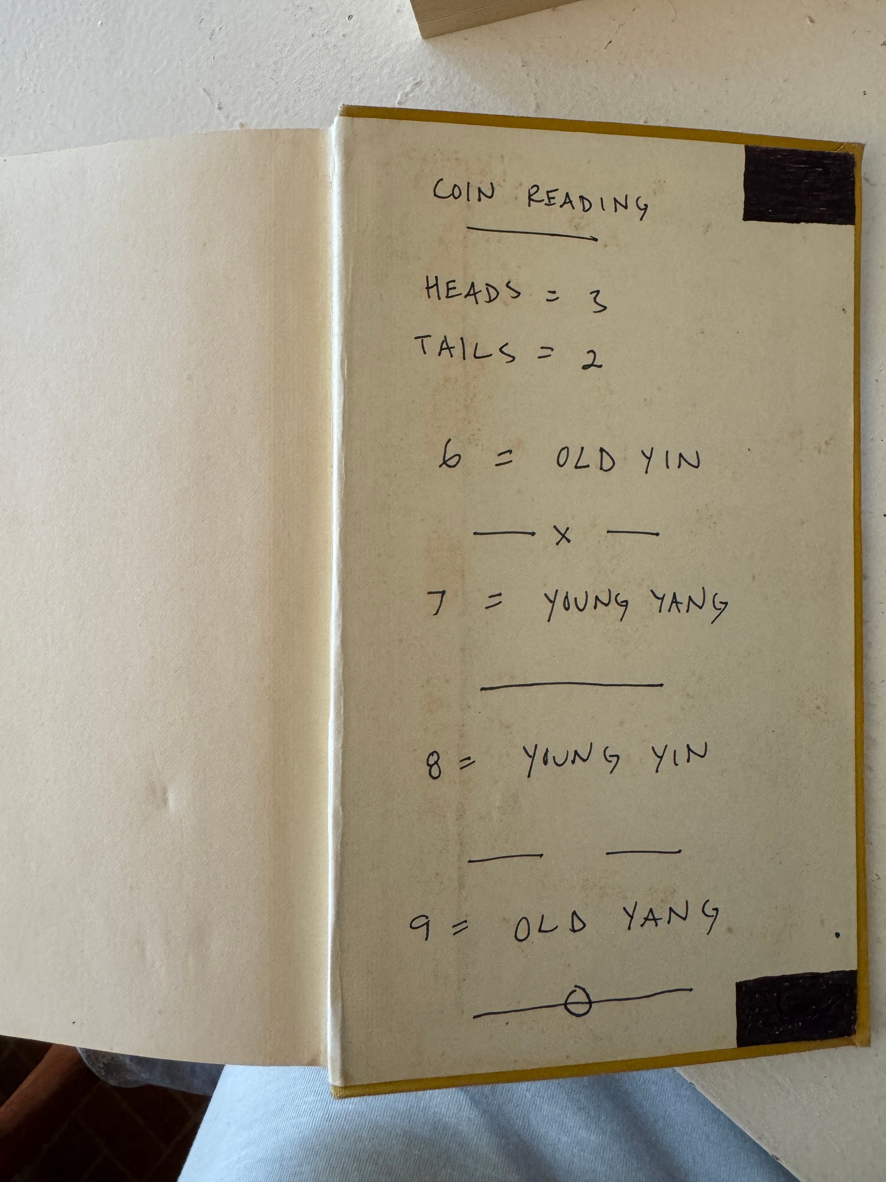 Each coin’s side corresponds to a number. Heads is 3, tails is 2. Their sum brings a line, broken or solid. Three heads or tails indicates a special reading.