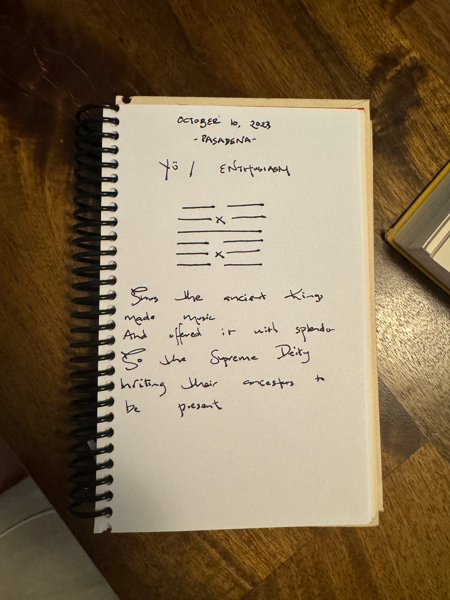 Reading “enthusiasm” and the trigram’s militarily specific explanation in the beginning of the weathered yellow book turns my stomach upside down. But then there it is, like always.