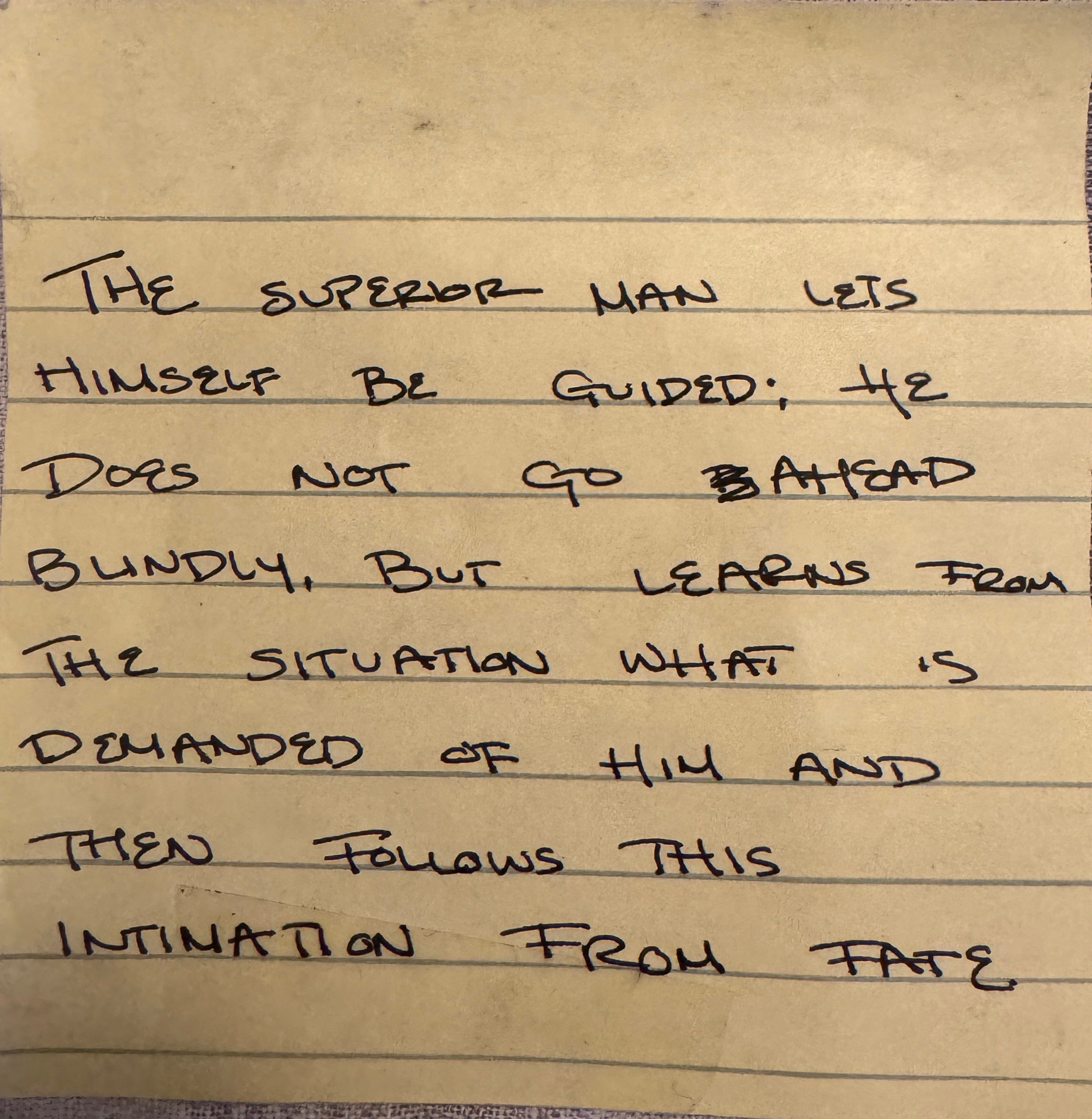 “The superior man lets himself be guided; he does not go ahead blindly, but learns from the situation what is demanded of him and then follows this intimation from fate.”